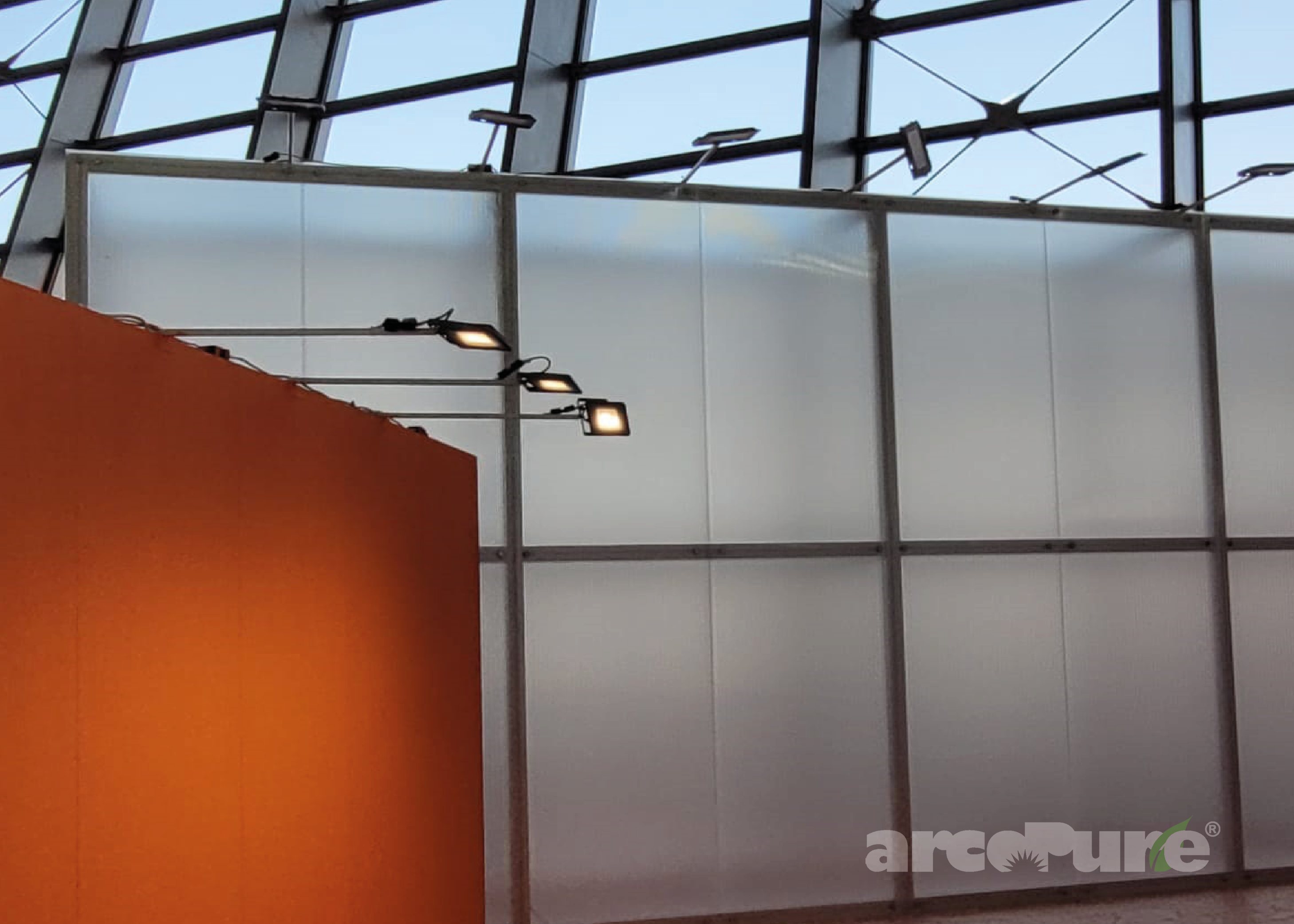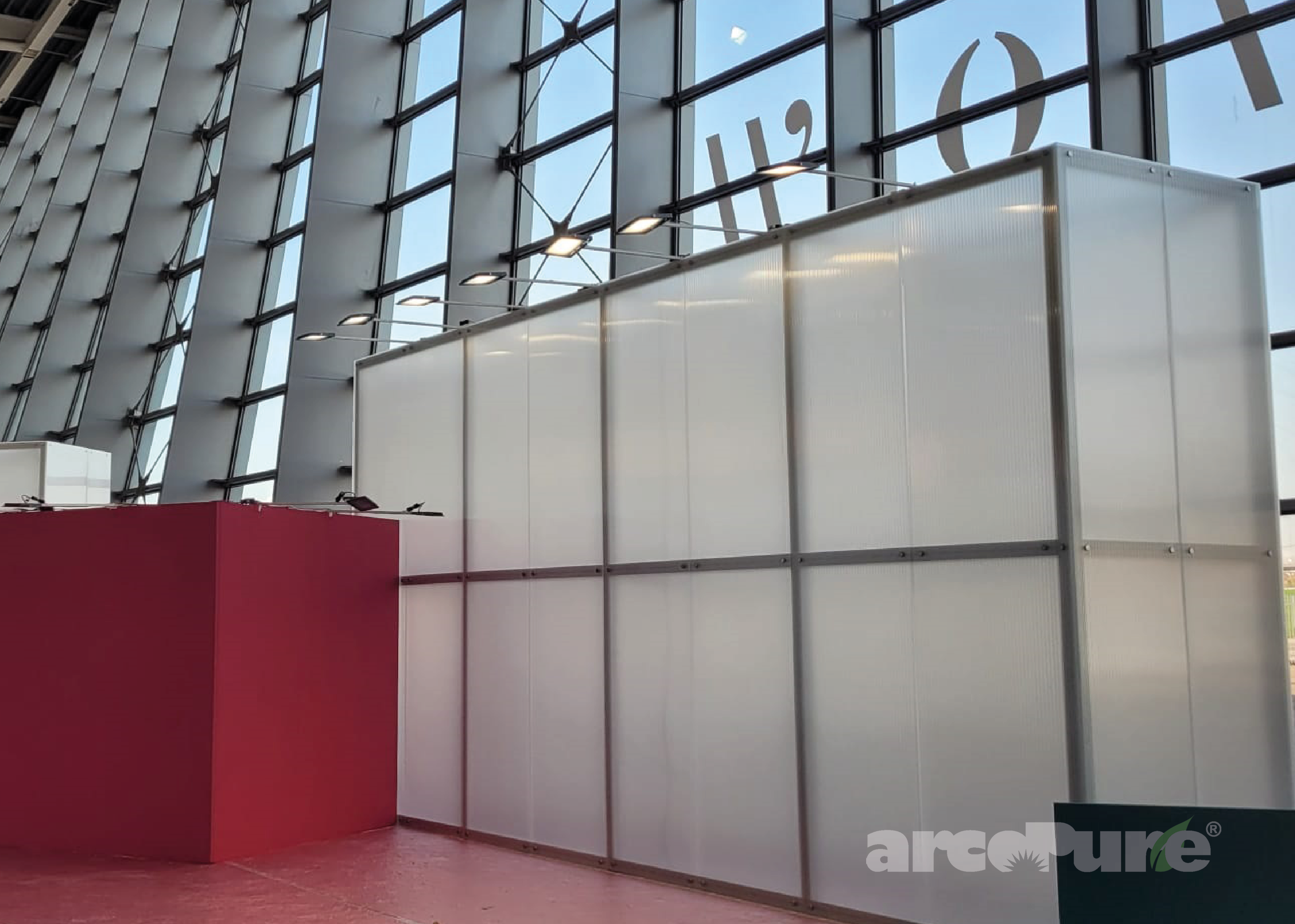 Il filo conduttore che accomuna le cinque aree, caratterizzate da cromie vivaci e luminose, è la scenografia trasparente e brillante, capace di riflettere e diffondere la luce naturale all’interno dei padiglioni. Inoltre, le nostre lastre in policarbonato riciclato sono state personalizzate con l'innovativa nanotecnologia arcoPure, che purifica l'aria all’interno del padiglione riducendo le particelle inquinanti di tipo VOC e NOx. Questo trattamento superficiale, applicato tramite nebulizzazione elettrostatica, si attiva grazie alla componente UV della luce solare. Attraverso il processo di fotocatalisi, modifica la struttura molecolare delle particelle inquinanti, trasformandole in molecole inerti di sali minerali e vapore acqueo, migliorando così la qualità dell’aria respirata all'interno degli spazi.