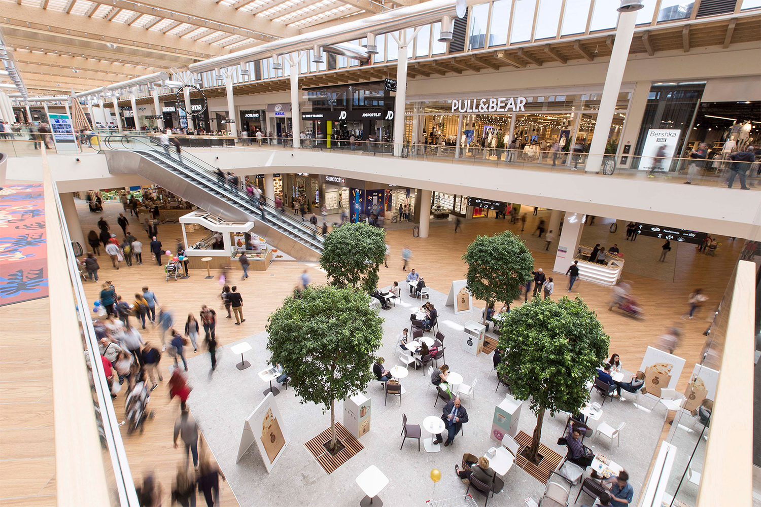 Progettato da Davide Padoa – Design International, in collaborazione con Michele De Lucchi e Arnaldo Zappa, il complesso si estende su 92.000 mq, ospita 200 negozi, 25 punti ristorazione, un polo sportivo indoor e outdoor e 6.000 posti auto. L’edificio combina funzionalità e sostenibilità, rispettando gli standard LEED Gold del U.S. Green Building Council.