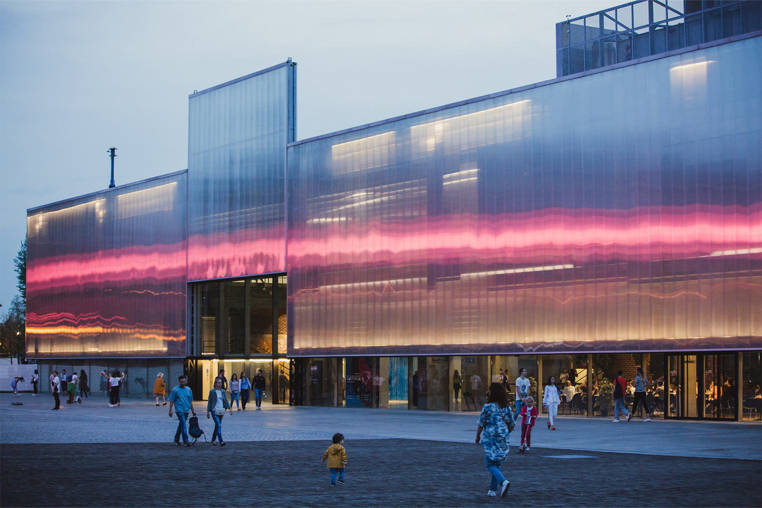 Questo sistema a doppia parete riduce il ricorso a climatizzazione e riscaldamento, sfruttando l’illuminazione naturale e gestendo i flussi convettivi d’aria per il comfort interno in ogni stagione. I grandi portali scorrevoli 10x10 m utilizzano la stessa tecnologia, unendo funzionalità e continuità estetica. La superficie continua in policarbonato crea riflessi cangianti che integrano l’edificio con il Gorky Park, conferendo armonia e carattere al complesso architettonico.