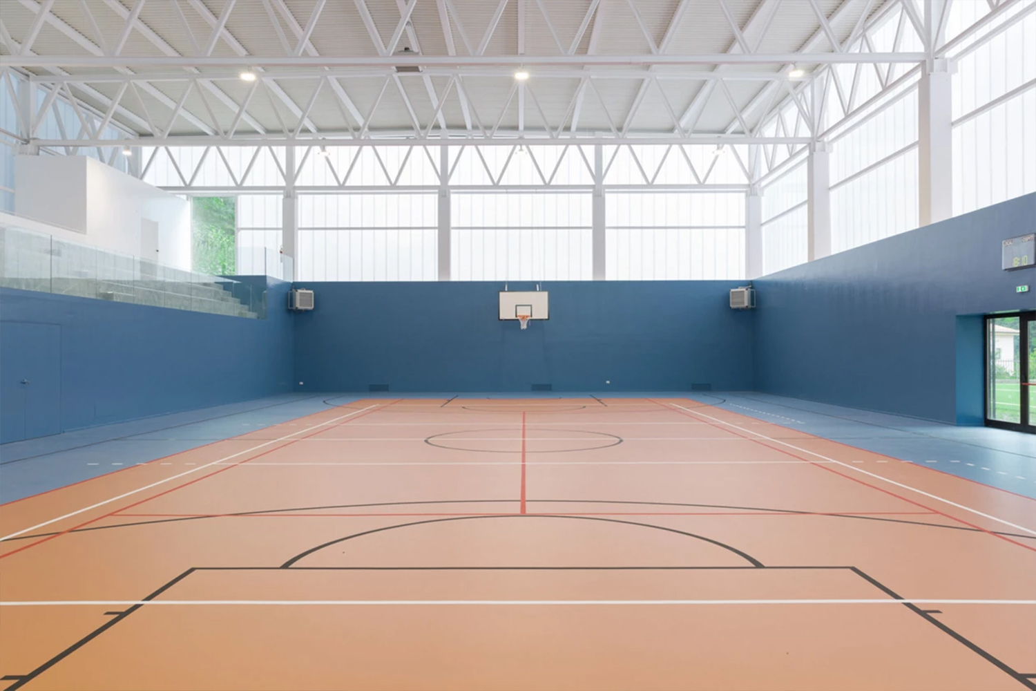 La trasparenza del policarbonato permette di intravedere le attività interne, stimolando curiosità e relazione visiva tra esterno e interno. L’edificio è pensato per un uso continuo: durante il giorno accoglie gli studenti della scuola, nel pomeriggio le squadre sportive, con ingressi separati per sicurezza e funzionalità. La combinazione tra materiali materici e traslucidi, unita a dettagli geometrici e colorati, conferisce profondità, leggerezza e luminosità, trasformando la palestra in un luogo aperto e accogliente per tutta la comunità.
