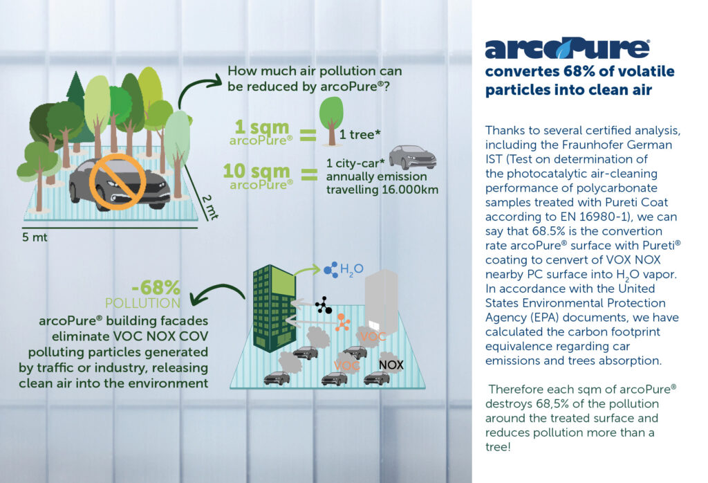 arcoPure® è il risultato della collaborazione tra l’esperienza della dott.gallina nell’estrusione di lastre in policarbonato e le innovazioni di Pureti NanoAir Solutions nell’ambito delle nanotecnologie di 4° generazione. Grazie a questa partnership tecnica, il trattamento fotocatalitico brevettato di Pureti® viene applicato direttamente sul lato esterno dei pannelli arcoPlus® durante il processo di estrusione, consentendo di ottenere superfici autopulenti che riducono l’inquinamento atmosferico, riducono gli odori e soprattutto