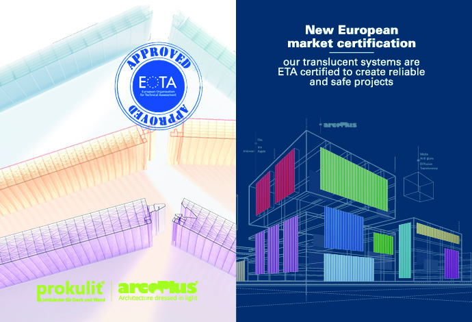 Comunichiamo che i nostri sistemi traslucidi arcoPlus547, arcoPlus549, arcoWall5613, Prokulit540-3, Prokulit540-7, Prokulit560-11 hanno ottenuto la “certificazione ETA” europea che consente di realizzare progetti affidabili e sicuri.