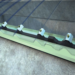 | dettaglio del terminale di gronda dei lucernari con inserimento di parapassero in PE |
