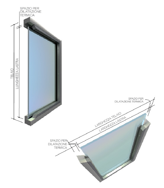 Una particolare attenzione deve essere rivolta durante il taglio delle lastre, affinchè vi sia uno spazio sufficiente per la dilatazione termica, evitando tensioni sul materiale. La tolleranza deve essere presente sia nella larghezza, che nella lunghezza. In base alle dimensioni dei telai, dalla tabella a fianco si riporta il valore per la rifilatura delle lastre per permettere l’espansione termica delle lastre. L’innesto del bordo deve avere una profondità sufficiente per consentire l’espansione del materiale, ed evitare che la lastra esca dal telaio.