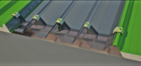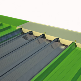 Si tratta di pannelli sovrapposti lateralmente con pannelli metallici grecati coibentati per copertura. Il particolare disegno del profilo, rende il sistema perfettamente sovrapponibile a tutti i principali tipi di pannello. Pendenza minima 5%.