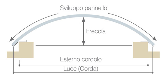 realizzazione di copertura continua, ottenuta mediante sovrapposizione laterale continua dei pannelli di policarbonato. Gli elementi vengono prodotti con raggio di curvatura R.3.300 mm o R.6.000 mm.